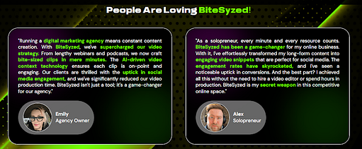 - Time-Efficient: Save countless hours on manual editing and content creation. BiteSyzed streamlines the process, allowing you to focus on other aspects of your business.